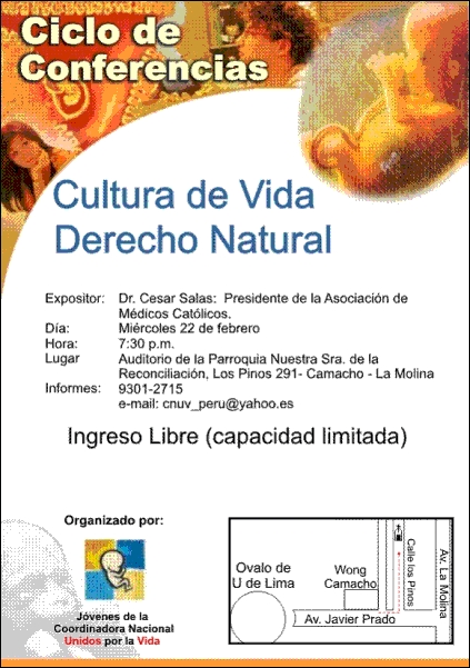 Lima.- Con la finalidad de hacer cotidiana una Cultura de Vida que promueva y defienda en la sociedad, la dignidad del ser humano desde su concepci�n hasta la muerte natural, los j�venes de la Coordinadora Nacional Unidos por la Vida, organizar�n a lo largo de este a�o un Ciclo de Conferencias en el que se abordar�n temas sobre la promoci�n y defensa de la Vida Humana.